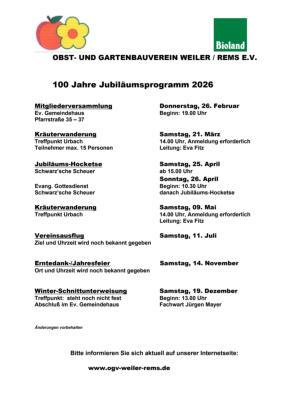 BiozertifizierungDer Obst- und Gartenbauverein Weiler/Rems e.V. unterstützt seine Mitglieder seit 2017 bei der Erzielung eines höheren Mostobstpreises durch eine Sammel-Zertifizierung der Streuobstflächen.Partner sind die verkehrsgünstig liegende Annahmestelle• Christian Schall, Am Dreschschuppen, Schützenstr. Schorndorf-Weiler und für die Abnahme und Vermarktung•Dr. Willy Kumpf GmbH, Industriestr. 22 in 71706 Markgröningen (Unterriexingen). Die Zertifizierung erfolgt über die Kontrollgesellschaft ökologischer Landbau mbH und Bioland e.V. -Verband für organisch-biologischen Landbau.Die Auszahlung des höheren Mostobstpreises erfolgt sofort bei der Obst-Anlieferung.Die Kosten der Sammel-Zertifizierung werden jährlich nachträglich i. d. R. nach der darauffolgenden Mitgliederversammlung wie folgt abgerechnet und per Lastschrift eingezogen:•Fixbetrag in Höhe von EUR 0,15 je Apfelbaum pro Teilnehmer, zur Deckung des Verwaltungsaufwands. Wer sich als Erzeuger von Bioland-Obst beteiligen möchte, wird Mitglied beim Verein, meldet seine Obstflächen mit Apfel- und Birnenbäumen an und schließt einen Vertrag mit dem OGV ab.Damit geht er die Verpflichtung ein, die Obstflächen ausschließlich nach den aktuellen EU Verordnungen zum ökologischen Landbau zu bewirtschaften und bei Bedarf nur Dünge- und Pflanzenschutzmittel zu verwenden, die für den ökologischen Landbau zugelassen sind.Die notwendigen Formulare als PDF zum Download finden Sie hier: