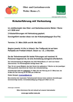 BiozertifizierungDer Obst- und Gartenbauverein Weiler/Rems e.V. unterstützt seine Mitglieder seit 2017 bei der Erzielung eines höheren Mostobstpreises durch eine Sammel-Zertifizierung der Streuobstflächen.Partner sind die verkehrsgünstig liegende Annahmestelle• Christian Schall, Am Dreschschuppen, Schützenstr. Schorndorf-Weiler und für die Abnahme und Vermarktung•Dr. Willy Kumpf GmbH, Industriestr. 22 in 71706 Markgröningen (Unterriexingen). Die Zertifizierung erfolgt über die Kontrollgesellschaft ökologischer Landbau mbH und Bioland e.V. -Verband für organisch-biologischen Landbau.Die Auszahlung des höheren Mostobstpreises erfolgt sofort bei der Obst-Anlieferung.Die Kosten der Sammel-Zertifizierung werden jährlich nachträglich i. d. R. nach der darauffolgenden Mitgliederversammlung wie folgt abgerechnet und per Lastschrift eingezogen:•Fixbetrag in Höhe von EUR 0,15 je Apfelbaum pro Teilnehmer, zur Deckung des Verwaltungsaufwands. Wer sich als Erzeuger von Bioland-Obst beteiligen möchte, wird Mitglied beim Verein, meldet seine Obstflächen mit Apfel- und Birnenbäumen an und schließt einen Vertrag mit dem OGV ab.Damit geht er die Verpflichtung ein, die Obstflächen ausschließlich nach den aktuellen EU Verordnungen zum ökologischen Landbau zu bewirtschaften und bei Bedarf nur Dünge- und Pflanzenschutzmittel zu verwenden, die für den ökologischen Landbau zugelassen sind.Die notwendigen Formulare als PDF zum Download finden Sie hier: